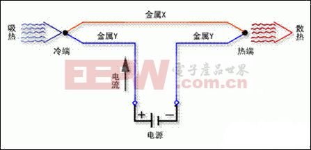 半导体制冷器是由半导体所组成的一种冷却装置,也叫热电制冷,其理论基础帕尔帖效应,即通上电源之后,冷端的热量被移到热端,导制冷端温度降低,热端温度升高。如图所示,由X及Y两种不同的金属导线所组成的封闭线路。